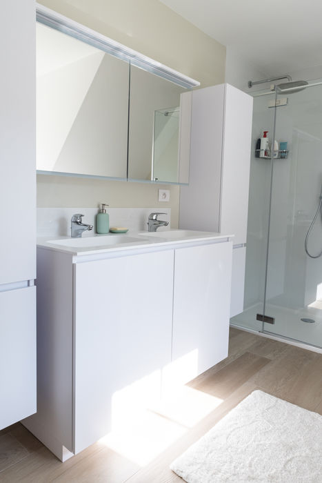 In Boezinge hebben we een badkamer volledig gerenoveerd tot een strakke en functionele ruimte. Centraal staat een stijlvol wit meubel met dubbele lavabo’s, geflankeerd door twee praktische witte kasten die zorgen voor veel opbergruimte. De regendouche biedt een luxe douche-ervaring, terwijl de subtiel geplaatste handdoekradiator achter de deur de ruimte optimaal benut.